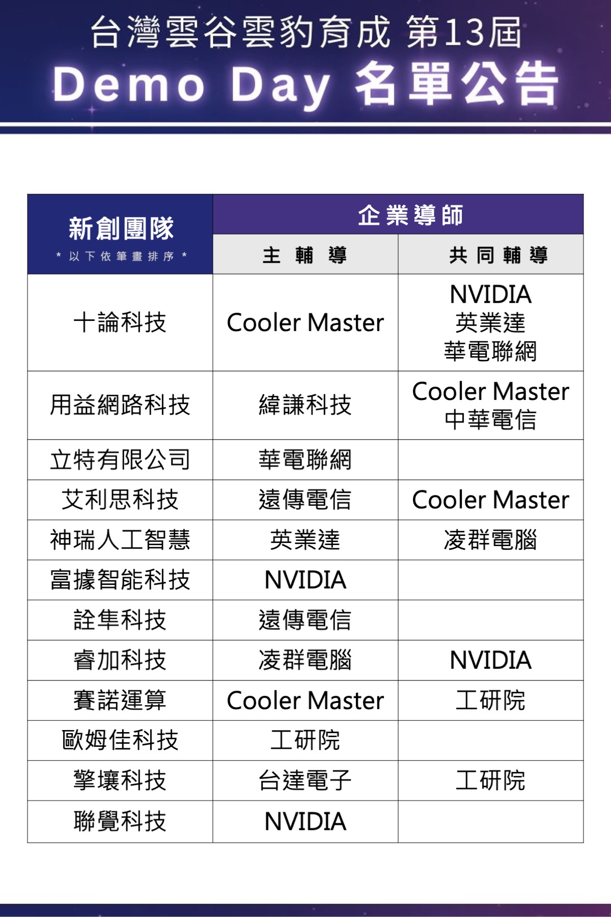 歷經超過 3 個月的共創輔導期,雲豹13班 與 10 家企業導師攜手合作,從技術突破、場域驗證到商務拓展進行深度交流。最終有 12 家新創團隊脫穎而出,將於今年 Demo Day 中角逐「千萬投資意向」,向企業、創投與生態圈夥伴展現無限潛能!